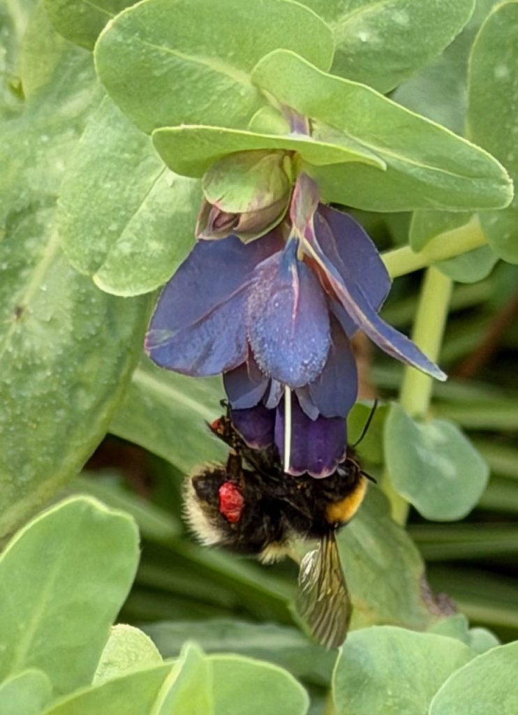 If you want to grow something that’s great for our longer tongued bees like the hairy footed flower bee (Anthophora plumipes) and our carder bumblebee (Bombus pascourum) as well as the garden bumblebee (Bombus hortorum) and our red tailed bumblebee (Bombus lapidarius), then honeywort (Cerinthe major purpurescens) is a good choice.